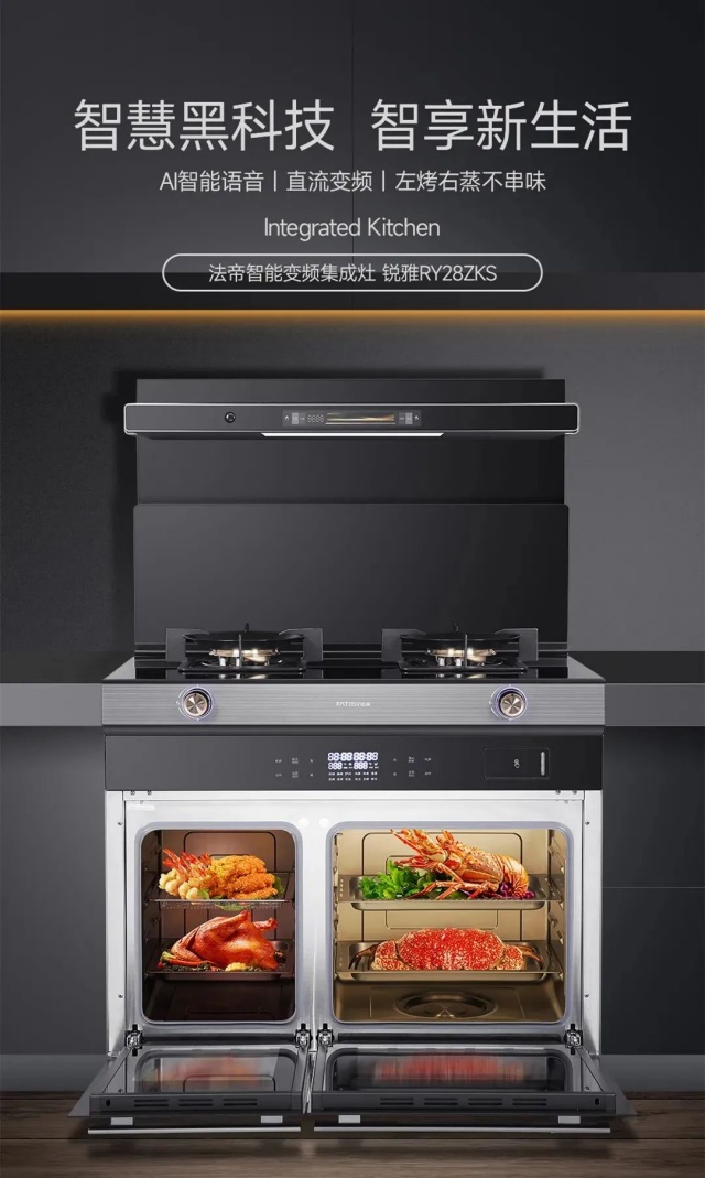 法帝銳雅RY28ZKS獨立蒸烤變頻集成灶,下方自帶大容量蒸箱和烤箱,可謂是海納百川,可以一次性放置四層蒸烤架,同時蒸、烤/炸,互不串味,滿足大家庭的飲食所需,過節聚會也能輕松hold住!