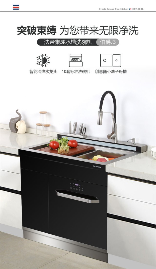 法帝集成水槽洗碗機,集清洗、保潔、烘干、存儲等功能于一體,超寬超深大通槽設計,輕松容納整個菜板和鍋具,清洗更加游刃有余。大通槽還可以秒變子母槽,不必來回走動,在水槽前即可完成洗切瀝等備菜工作。