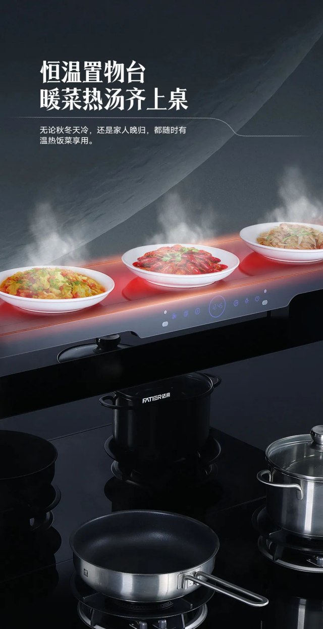 法帝X5保潔柜款集成灶搭載頂部恒溫暖菜功能,做好的菜肴可以放在集成灶頂部的恒溫爐上,不僅可以恒溫鎖熱,而且還能保留營養(yǎng),端上桌的菜肴全都是熱乎乎的。