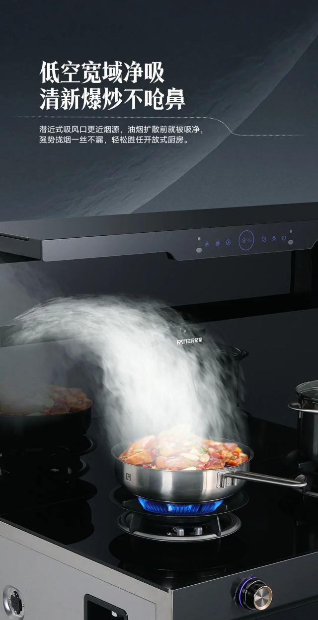 法帝X5ZK蒸烤一體集成灶采用了潛近式吸風(fēng)口,源點低吸,煙源更近,吸得更凈,從根源防止油煙擴散,強勁動力瞬吸油煙不撲臉,高效解決廚房油煙難題,呵護她的美麗容顏和健康。