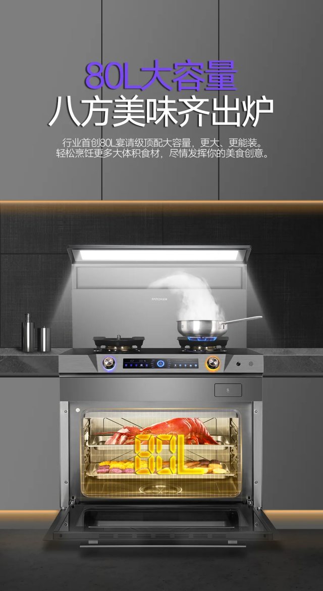 下方搭載80L頂配級大容量蒸烤箱,在其硬核的烹飪實力下,為你帶來美食的豐盛滋味。炎熱夏季只需要把食材配好,放到蒸烤箱,全家人所需的美味都能同時出爐,不用忍受廚房高溫,便捷省心,生活真輕松。